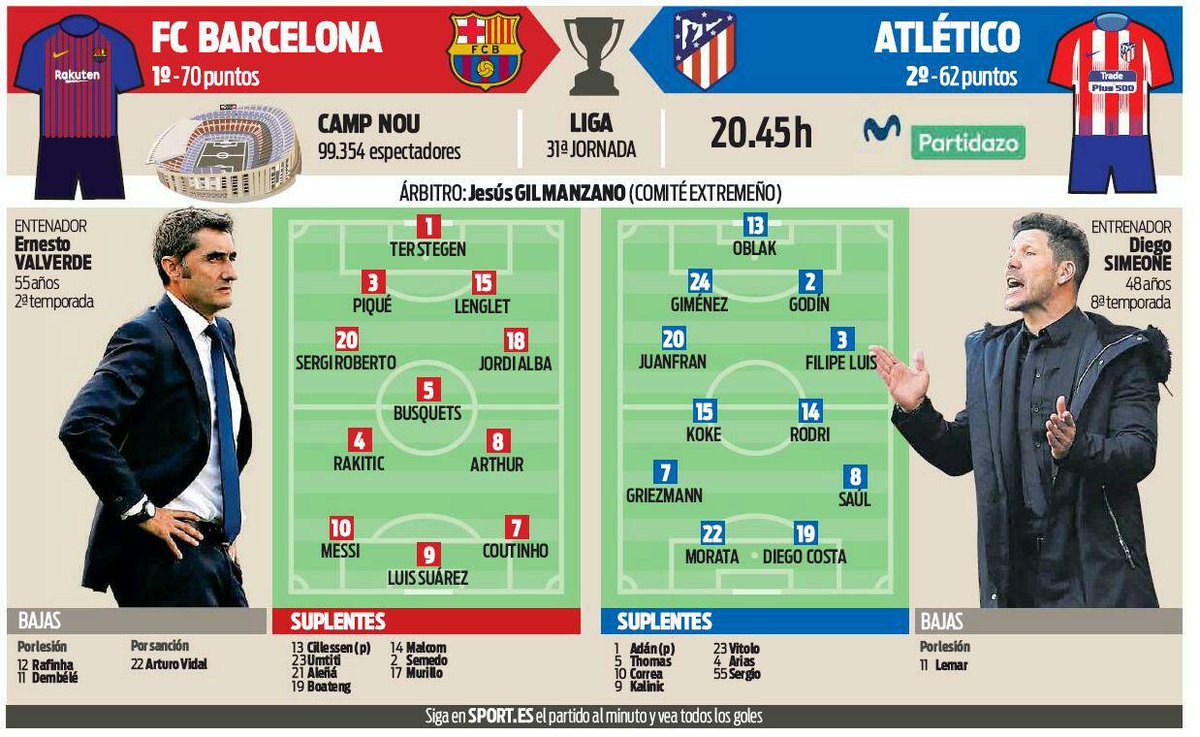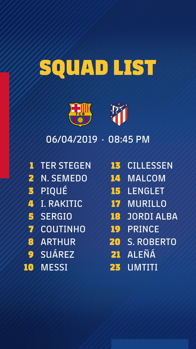 Ernesto Valverde kijelölte keretét az Atlético Madrid elleni rangadóra. Sérülés okán Rafinha és Dembélé, technikai döntés miatt Todibo és Vermaelen a kimaradók névsora. Sárga lapos eltiltás miatt Arturo Vidal szintén csak a lelátóról figyeli majd az összecsapást.