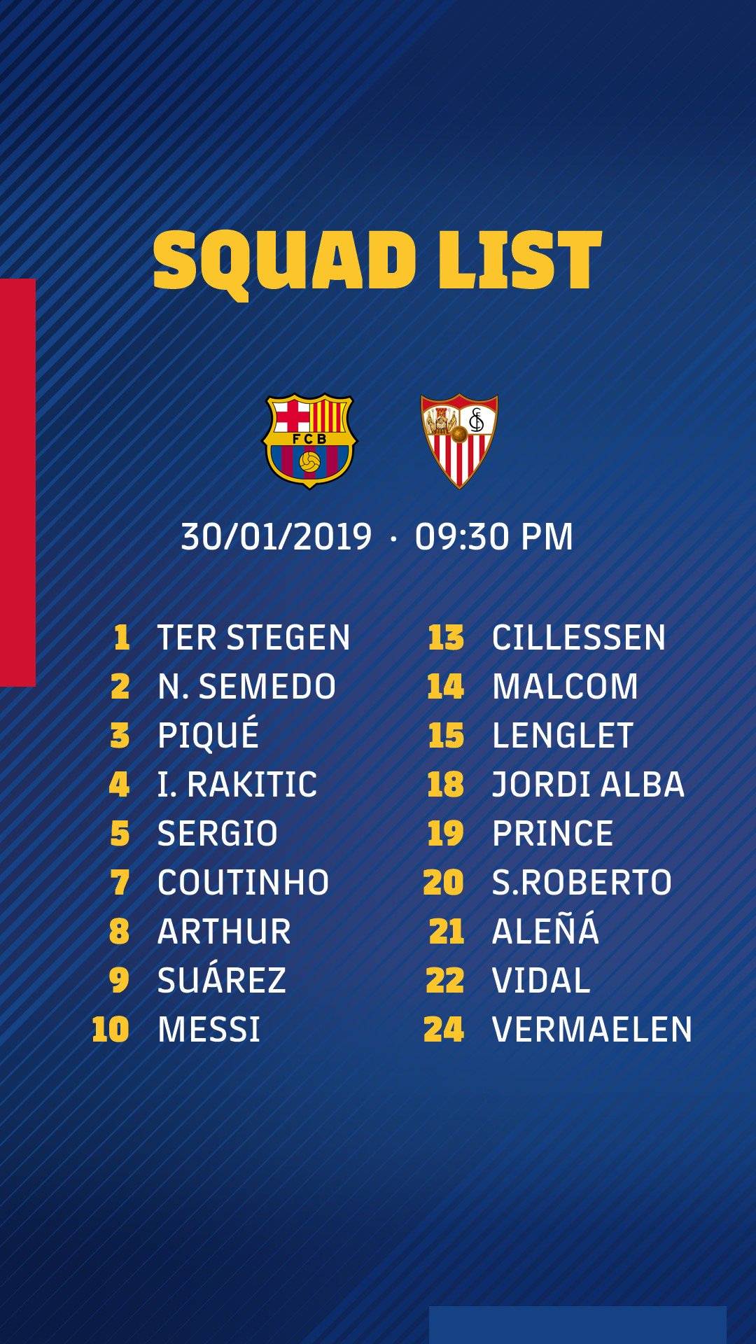 Ernesto Valverde kijelölte keretét a Sevilla elleni Király-kupa visszavágóra. Sérülés okán Umtiti, Rafinha és Dembélé, technikai döntés miatt Murillo, Samper és Denis a kimaradók névsora.
