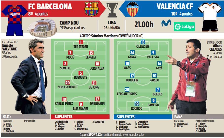 Ernesto Valverde kijelölte keretét a Valencia elleni hazai spanyol bajnokira. Sérülés miatt Neto, Umtiti, Messi és Dembélé a kimaradók névsora. A világbajnok középső védő, Samuel Umtiti körülbelül egy hónapra dőlt ki a sorból, az elkövetkező időszakban nem számíthat a szolgálataira az edzői stáb. Iñaki Peña, Carles Pèrez és Ansu Fati nevét ezúttal is tartalmazza a mérkőzésre leadott lista.